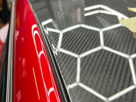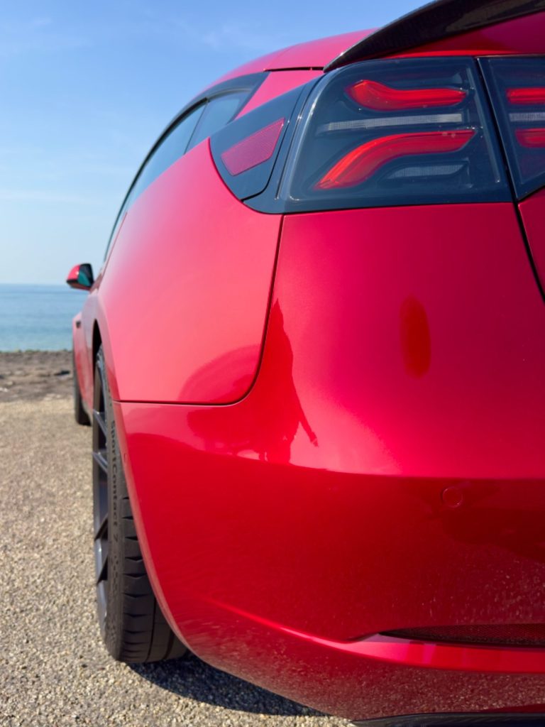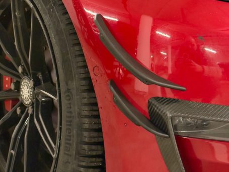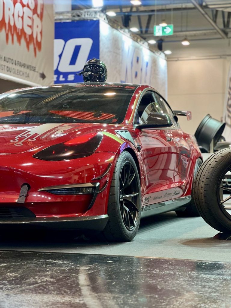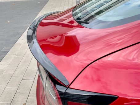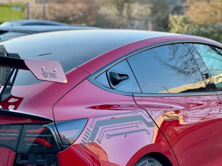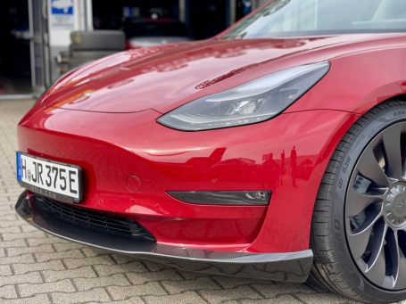 Exklusiv entwickelte und gefertigte Kotflügel-Entlüftung sowie Canards. Weltweit das einzige Model 3 mit dem Flügel, Kotflügel-Entlüftung und Canards – inklusive Straßenzulassung.
