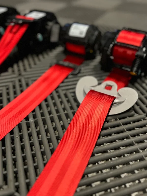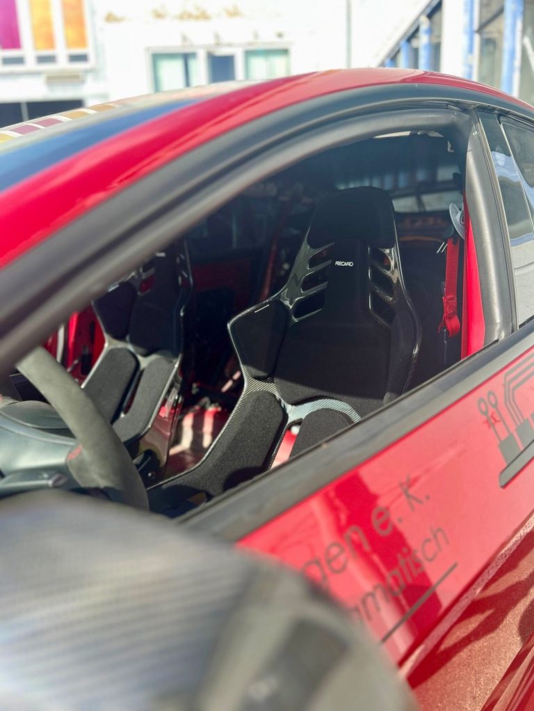 - Für die Rennstrecke liegen rote 6-Punkt-Gurte von Sandtler bereit und warten auf den nächsten Trackday