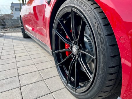 - Felgen Einzelanfertigung von unserem Partner A&M E-Sport (Link) – RS5-Felgen in 18×10 Zoll, ET 24, matt-schwarz, bestückt mit Yokohama Advan A052 in 275/40. Keine Straßenzulassung.